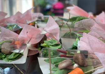 赛前准备 物品摆放整整齐齐。爸爸们大显身手,孩子们还准备了特别的蔬菜花束。